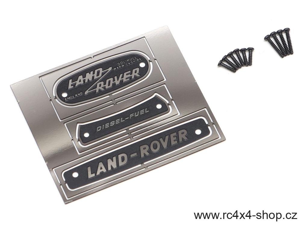 Sada kovových štítků s emblémy pro Land Rover Series III 109 na podvozku BRX02 od Boomracing. Součástí balení je i spojovací materiál.